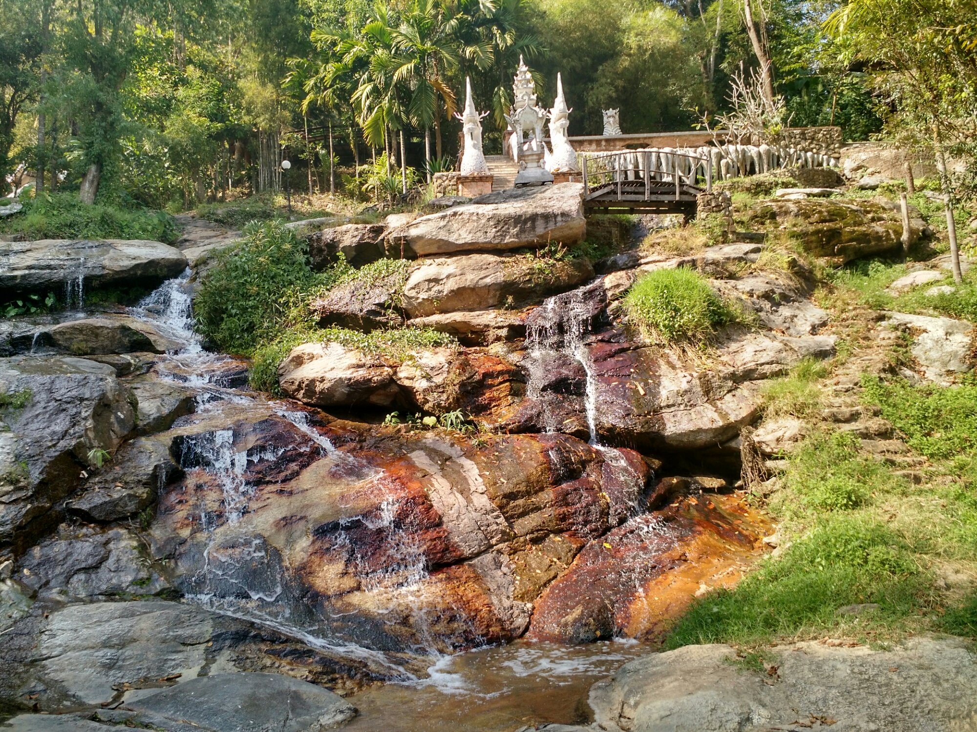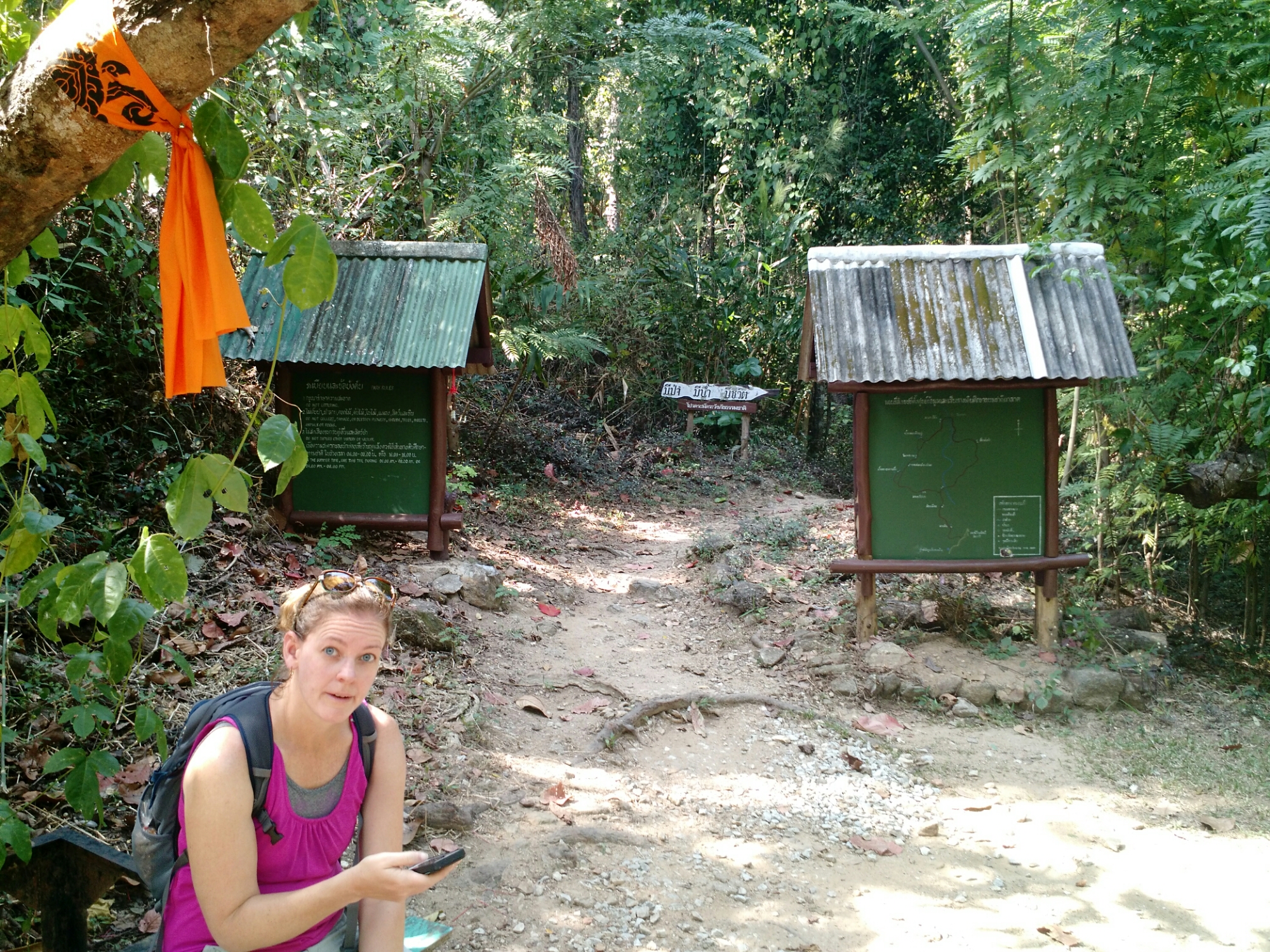 Yes, I had. But what he meant was had I memorized it so I’d know if were on the path. Nope. However, I saw a Thai map at the trailhead and took a picture to reference later. Between our two tools (or us two tools?), we navigated a shaded jungle climb up the mountain. On the path, monks had built a monastery by a waterfall; we might have been wise to call it a day here, but we kept going!