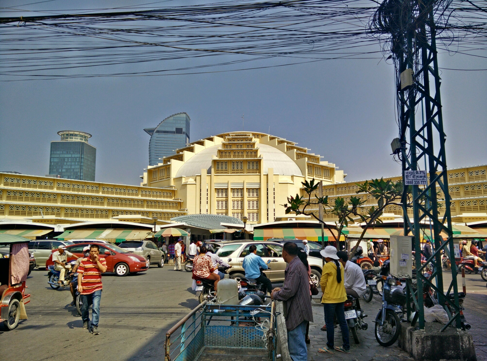 We’ve seen a lot of markets and malls, but they say Phnom Penh’s is not to be missed. The largest in Asia when it was first built in 1937, it was updated in after having been bombed in the Fraco-Thai war and then again in 1992. It is a spoke and wheel environment, so the center archway shows glittering gold and gems, then down one side is clothing, another produce and food, another school books and papers. One of the most interesting sections for us involved jeweler stands polishing, designing and crafting for clients who seemed to be getting the Chinese New Year holidays. No new bling for me, but lots of entertainment.